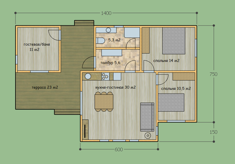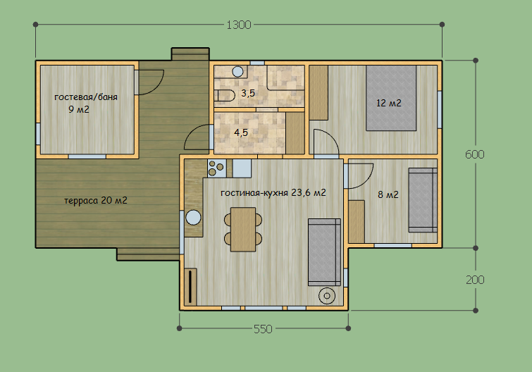 Оригинальная зимняя дача с двумя спальнями и баней, соединенные террасой. Адаптируется под любой участок:-))) Гостиная с панорамными окнами. Мансардный потолок над гостиной. Возможность антресоли над гостиной.